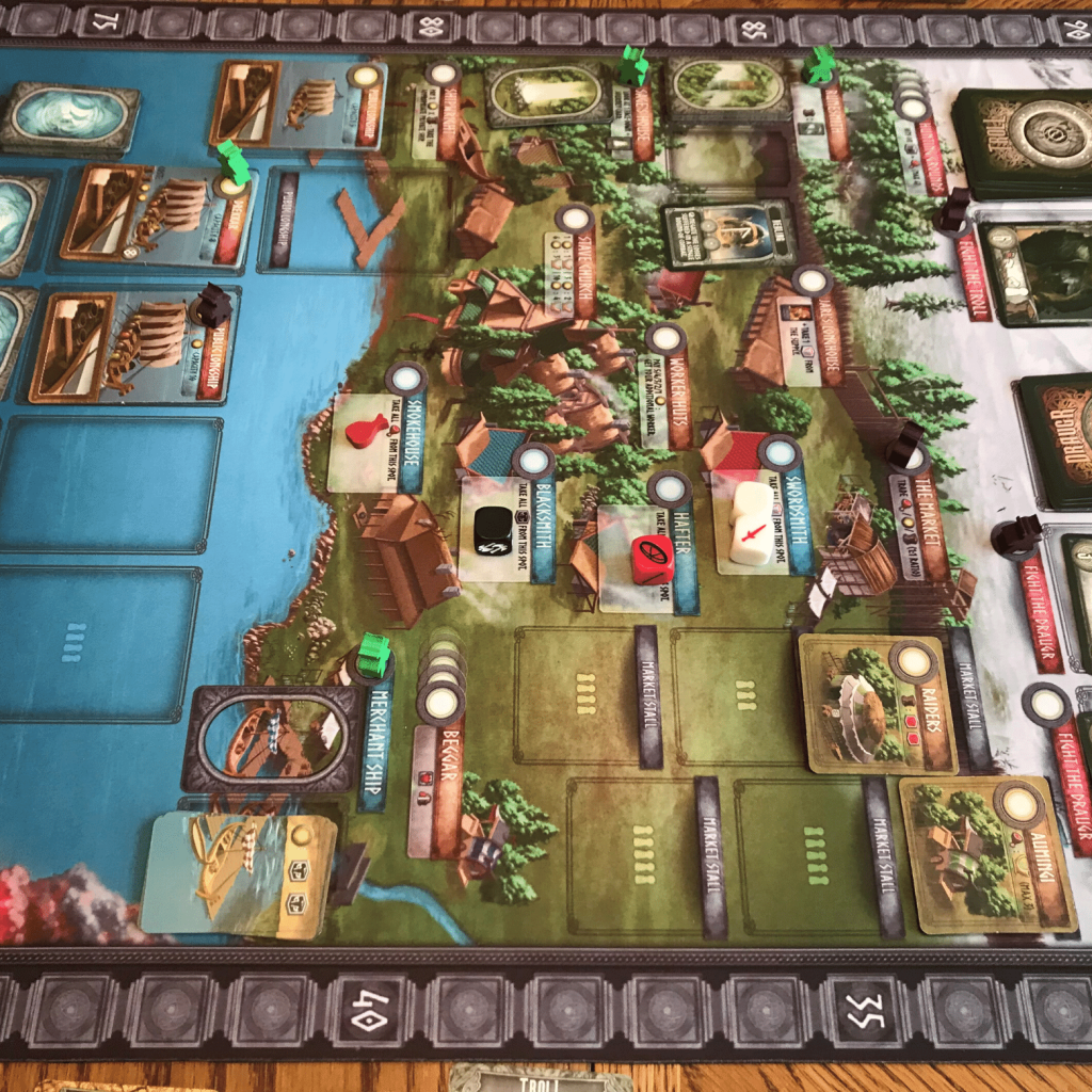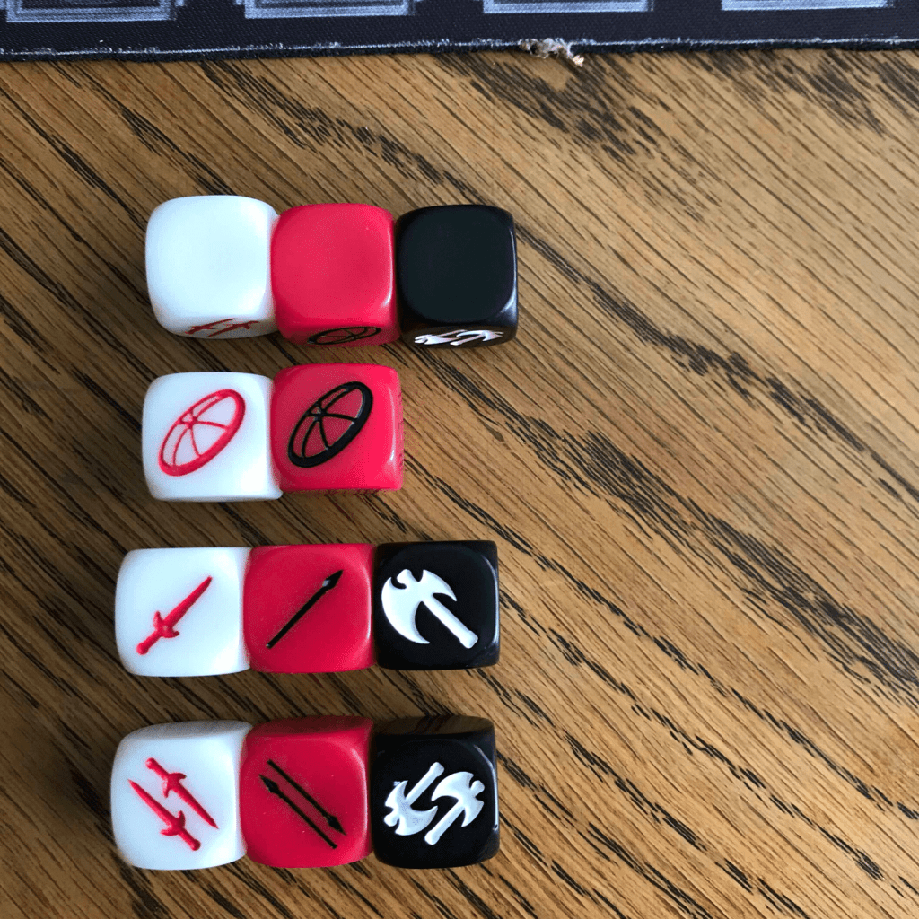 In the base game, there are three types of warrior dice. Swordsmen (white dice), Spearmen (red dice), and Axemen (black dice). Each player starts the game with one Swordsmen and there are always at least four opportunities on the board each round to gain warriors, sometimes five or six depending on what the Merchant Ship and Market tiles have to offer that round. There are also strengths and weaknesses to each type of warrior. The Swordsmen are the easiest dice to get but they are strictly the worst since they have three blank sides instead of two like the Spearmen and Axemen. The Axemen are best for attack, and Spearmen are the balance between both defense and offense when attacking. Also, since some of the trolls/draugr/monsters have certain dice that will not work against them, you’re not necessarily handicapped if the other player takes all the black dice that turn because there may be a space where black dice will not work so you’re better equipped with your red or white dice.