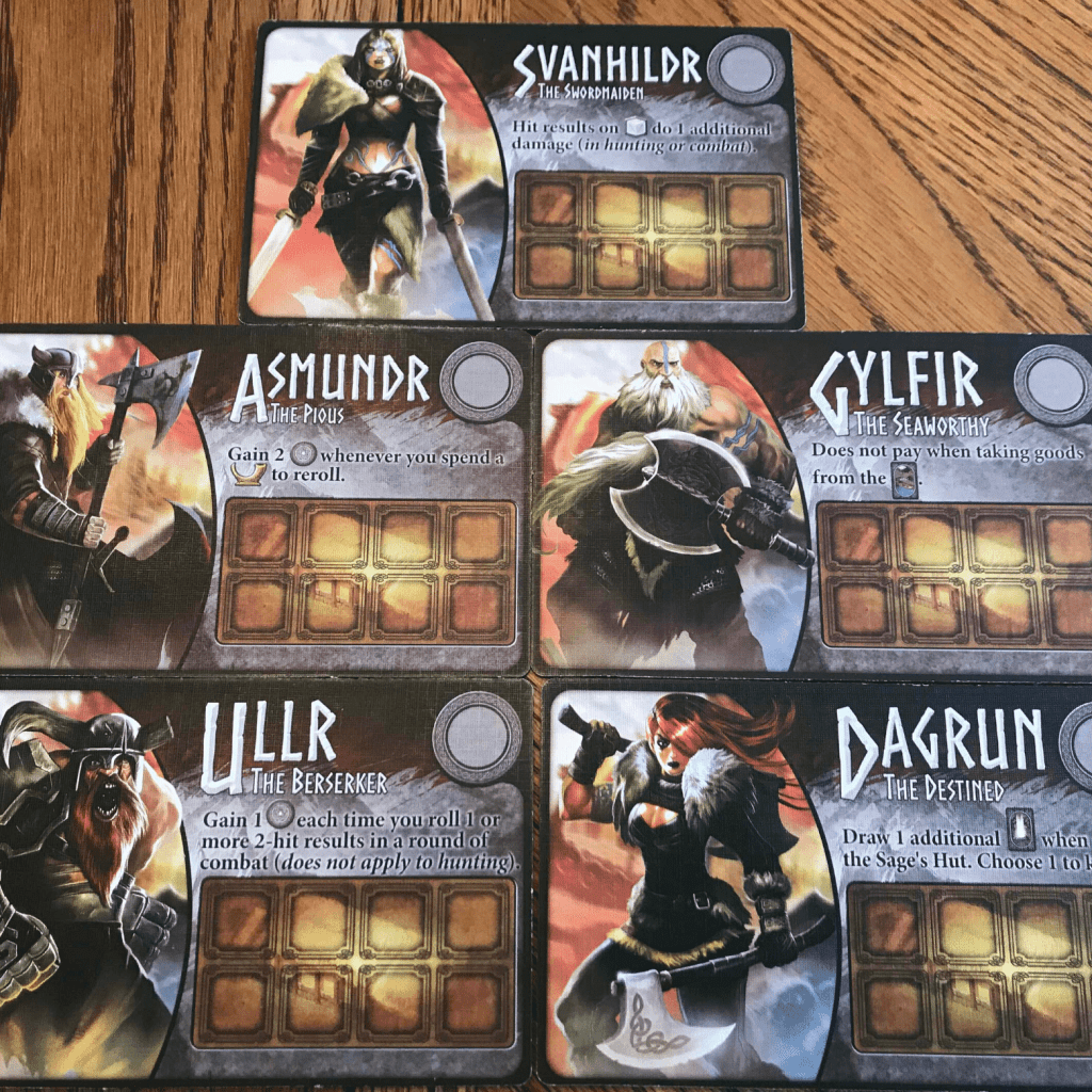 Let’s talk about the Viking Leaders. The base game comes with five leaders. Each Viking Leader has a special ability. For example if you choose to be Gylfir the Seaworthy then you do not pay when taking goods from the Merchant Ship (a placement spot that, just as its name suggests, is a ship which brings goods to Trondheim, with the goods/ship changing each round). The special abilities are different enough for each leader and give each of them their own unique feeling to play. These abilities can help you on your quest for the most glory, but at the same time, you do not have to rely on your leader’s special ability as part of your strategy to win because of all the options for scoring glory. Adding to the balance of the game, each Viking Leader has the same number of warriors (dice) slots available so no matter if you play with Asmundr the Pious or Svanhildr the Swordmaiden, you’re still going to have the same number of warriors to throw at hunting, killing a troll, fighting the draugrs, or even venturing across the sea to battle a mythical monster.