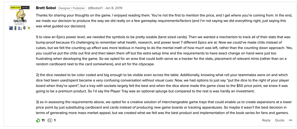 There are a few different routes with summer reading and board games you can take with your kids. You can choose to play board games with them that are based on books like The Reckoners, published by Nauvoo Games, based on The Reckoners trilogy by Brandon Sanderson. The books are great for young people twelve years old or older, who enjoy fantasy and action. Think Superman goes bad and mere humans have to try to stop him and his evil band of super powered friends. The board game does not have a lot of reading (read our review of the game here) but what I like about The Reckoners is that it’s a fun cooperative game that’s easy to learn and teach, which if your family is new to board games is always a plus. The one downside to The Reckoners game is the price point (see image below for game designer/publisher Brett Sobel’s response to our original Boardgamegeek.com review of The Reckoners, where he addresses their decisions when designing/publishing the game that made them choose to go with options that made it a higher price than some other cooperative games on the market).