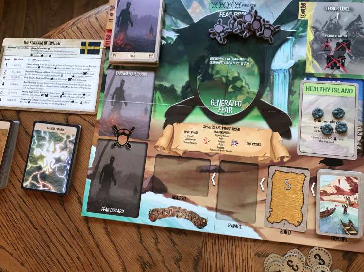 Mrs. Saint and I don’t particularly mind that most games of Spirit Island follow this pattern. In between the crushing uncertainty of the early game and the powerful inevitability of the late game, there are so many interesting choices to make. Figuring out how your chosen Spirits synergize, the opportunities presented by newly acquired Minor and Major Powers, identifying critical areas of the island and suppressing the Invaders there; there is so much to think about on most turns. And because so much of Spirit Island is deterministic, it is easy to tie good decisions made earlier in the game directly to your ascension to late game dominance (and vice-versa).
