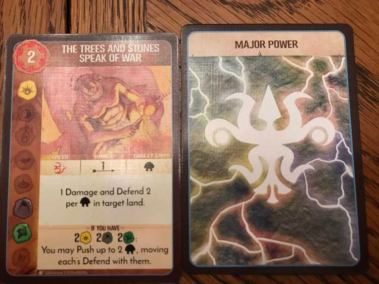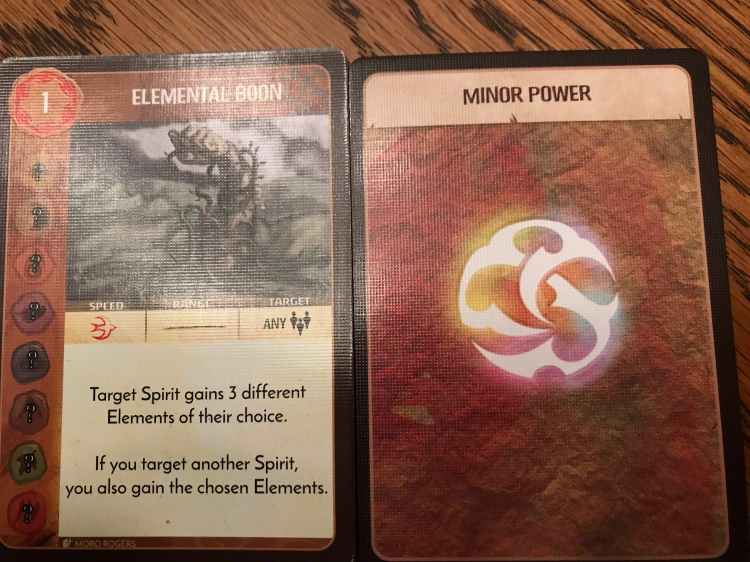 These cards will either resolve in the next phase or later in the turn based on whether they are fast or slow powers. Each card has an energy cost in the top left corner that must be paid when the card is played, as well as some elements on the left side of the card. These can be useful for reaching certain elemental thresholds for the turn and gaining access to your Spirit’s innate powers.
