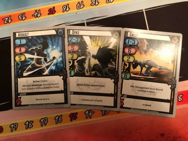 To illustrate what I’m talking about, let’s return to a character we have previously discussed on A New Challenger, Ken Masters. You’re at Range 2, and your opponent, playing as Ken, has just initiated a Strike and spent a gauge to make their attack Critical. A quick perusal of Ken’s reference card tells you that Axe Kick is the only thing that makes sense. As such, you set your Sweep, since confirming Sweep against Axe Kick will put you significantly ahead on resources and trade marginally on damage (the Ken player has already spent a gauge, and will lose a card at random while you both generate a new gauge). How surprised (and disappointed) are you when your opponent flips over his card to reveal a Spike?
