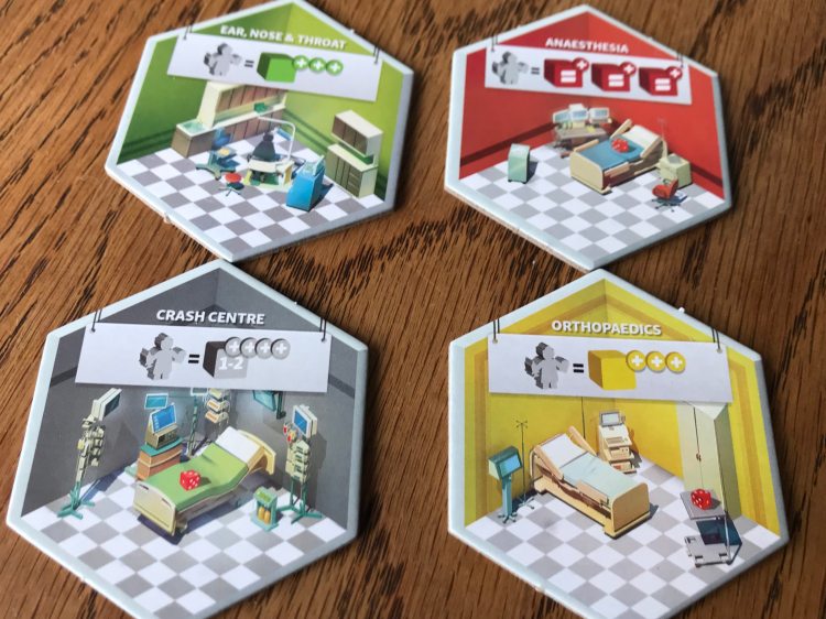 Your choice of numbers for each die may be impacted by looking at the rest of the play area. The middle of your play space will have the following: ambulances where the dice that are drawn for each round are placed, a hospital department tile and specialist cards, and the board where you keep track of your score. There will also be a pile of the new employee cards and a stack of the improvement tiles facedown.