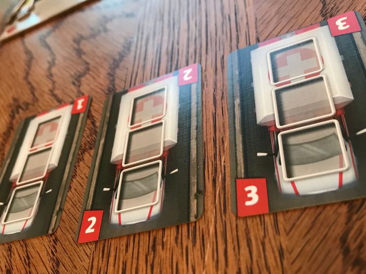 The first player then rolls the dice. Any dice with a 1 or 6 as its face value must be rerolled until it is neither a 1 or 6. After all dice have been rolled to an acceptable number, the first player then places them on the ambulances in ascending order. The Number 1 Ambulance gets the lowest number dice. If there is a tie between the face value of dice, the second player chooses which dice would go on which ambulance. Once all dice have been placed, the first player then chooses their ambulance. Note: since the lowest selected ambulance dictates who becomes the first player after this phase of play, the first player is not permitted to choose the first ambulance. However, using the two player version, if the first player chooses ambulance 2 and the second player chooses ambulance three, then the first player does not change going into the next phase of play. The player with the lowest selected ambulance is now the first player and receives a blood bag, which is a single use item that can be used to upgrade a single patient’s health by one.