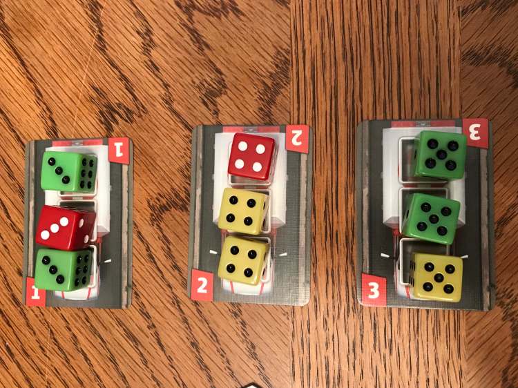 Play begins with the Patient Intake phase. The first player draws the appropriate amount of dice from the dice bag to fill the ambulances. The number of ambulances varies by player count, with each ambulance needing three dice. For a two player game, there are three ambulances, so you would draw nine dice.
